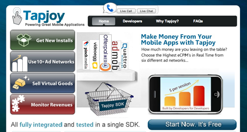 莫克还推荐开发商使用Tapjoy网站的功能(这一点可能有点争议),Tapjoy原名是Offerpal,去年因欺骗性广告事件而备受遣责,现在 该公司洗心革面,改面了发展策略。他们称Tapjoy的定位是“一款应用推荐和促销引擎,用虚拟商品和虚拟货 币奖励已安装某款应用,并正在试用其他产品的 用户。”目前使用了该网站服务的手机平台有8000万部,每月应用安装量达数百万次。