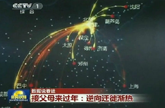 从1月26日开始,春节前的几天,春运进入高峰,每天都有数亿人次在全国各个城市之间迁徙,并随之产生各种各样的相关数据:哪条返乡之路最热?从北京回到哪个城市的人最多?哪个旅游城市今年最受欢迎?这些公众关心的话题其实都可以通过数据来反映出来,央视晚间 新闻 栏目敏锐地抓住了这一选题,并联合百度LBS定位大数据,恰逢其时地推出了“据说春运”特别节目。