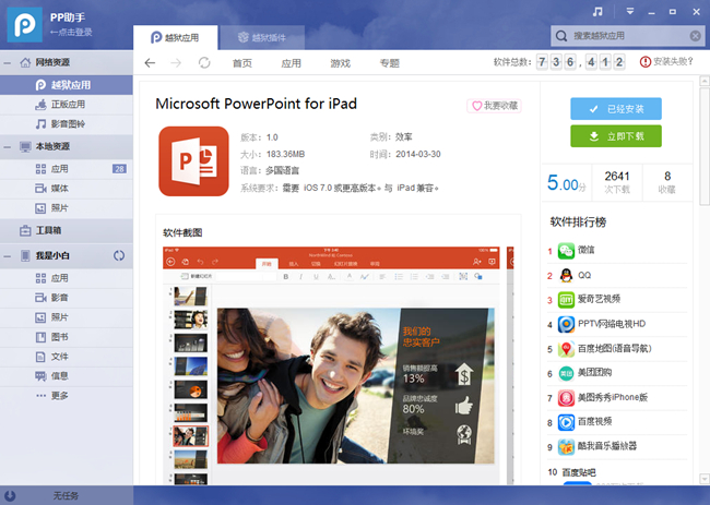 iWork办公套件为苹果官方出品,与微软的iPad版Office一样,需要独立安装。其中Pages着眼于文字处理,Keynote用于制作演讲演示幻灯片,而Numbers主要特色功能有智能表格、可移动画板、交互式打印等。iWork办公套件的特色在于它的模板丰富而精美,对文字排版和表格制作效果要求较高的用户可以到PP助手下载体验。