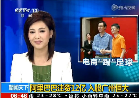6月5日,阿里巴巴董事局主席马云与恒大足球俱乐部负责人许家印宣布,阿里将向恒大方面支付12亿元,并持有恒大足球俱乐部50%股权。