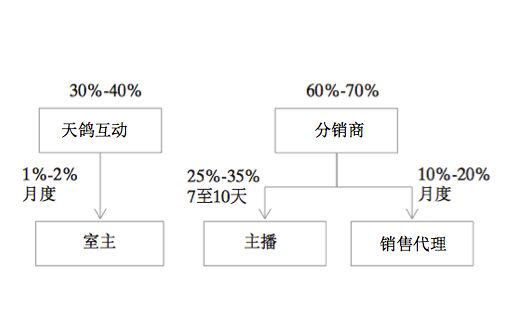 以下为天鸽平台参与者利益分配图。天鸽互动获得用户支出中的30%到40%、主播获得25%到35%、分销商获得5%到35%。