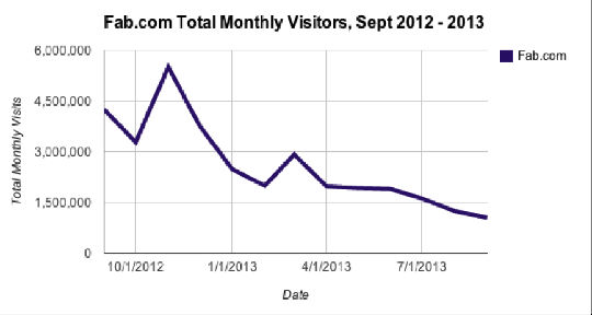 再则是流量的爆跌。根据市场研究公司Hitwise 的统计(如下图),2013年9月Fab网站的访问量为105万,而2012年9月这一数字为420万,一年时间网站流量已经下跌了75%。虽然曾有Fab的高管表示Fab更看重的是高素质的回头客,重视的是用户的质量而非数量,流量的下滑不会有太大的影响。但是电子商务的起点就是流量,而流量的暴跌一方面会严重影响公司业绩的增长,更重要的是反映了公司在消费者心中吸引力的下降,这对于一个处于发展中的创业公司来说,绝对是一个非常糟糕的现象。