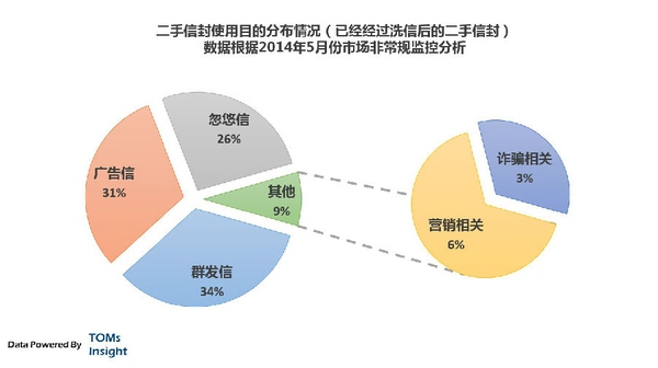 二手信:一手信经过洗信后,称为二手信。二手信一般以更小的单位出售,在二手信的黑市上,一个信封一般只是一千个号。二手信经过洗信人的封装,分成不同的种类,不同的种类有不同的用处,下面是几种比较常见的二手信: