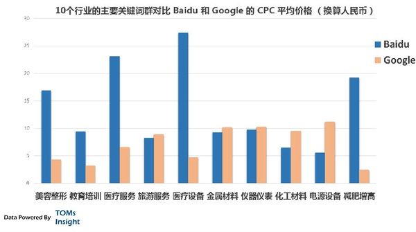 下图我们选取了互联网广告的热门的10个行业,通过技术手段对比了特定时间段内Baidu和Google的CPC价格(CPC是指Cost Per Click,广告投放后按照每一次点击付费,是Baidu和Google的主要广告售卖方式)