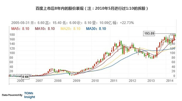 2013年,百度的股价一度到跌破90美元,成为一个低点。