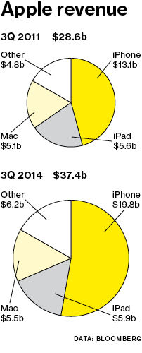 在这些新品背后则是一个截然不同的故事。当库克在3年前接替乔布斯出任苹果CEO时,外界对他并不看好。当时iPhone的销售额占到公司营收的一半以上(也为公司贡献了大部分毛利),但以三星为首的Android手机阵营的市场份额却在不断扩大,所以当年的苹果好像又重现了上世纪八九十年代与微软在PC领域争锋的形势,而在那一场战斗中,微软大获全胜。