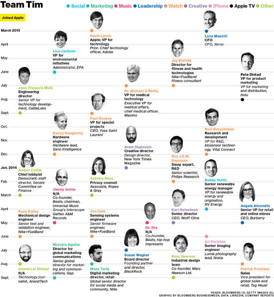 此外与以往相比,如今的苹果更乐意通过外部资源来提升公司的整体实力。在过去的几个月中,苹果广纳贤才,将很多时尚界人士招致麾下,这其中包括豪雅手表的前销售总监帕特里克·普鲁尼奥克斯(Patrick Pruniaux)、圣罗兰的前CEO保罗·丹尼夫(Paul Deneve)和巴宝莉的前CEO安吉拉·阿伦茨(Angela Ahrendts)等高级人才。