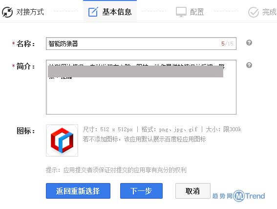进入页面后,填写基本信息,名称即轻应用默认搜索关键词,输入简短直接效果佳,应用简介每个字将有机会被亿万用户搜索到,图标logo是选填,尺寸:512 x 512px | 格式:png、jpg、gif | 大小:限300k,若不添加图标,该应用默认展示百度轻应用图标。