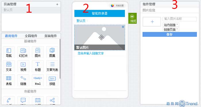 如图所示,在轻工厂拼接的应用有3列,表示为1的那一列是百度提供的现有组件,分为通用组件、全局组件、封面组件。通用组件下分为基础组件和功能组件以及自定义布局组件。基础组件分为导航、幻灯片、图片、图集、文本、视频、标题、文章列表、表格、链接、html、按钮,功能组件分为电话、短信、地图、分享、抽奖、留言板、通讯录,自定义布局组件有分栏、Tab、分隔符。全局组件有商务合作和统计2种,封面组件下有4种供选择。