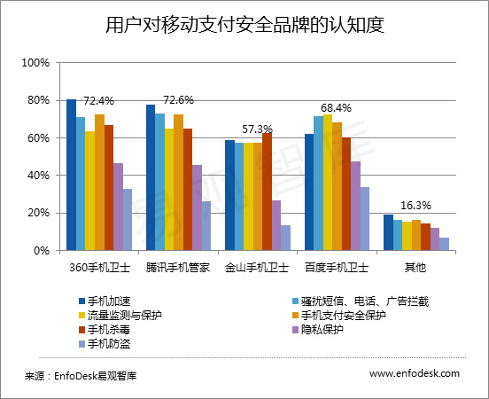 在移动支付进入高速增长的同时,也暴露出安全性能和稳定性能缺乏等隐患。据易观智库《2014年移动支付安全研究报告》显示,移动支付面临手机病毒、短信劫持、篡改交易、获取密码等多种安全风险。91.1%的用户选择使用第三方手机安全软件来防范手机支付风险,而腾讯手机管家在品牌认知度及安全功能的使用率上均领先于其他厂商,成为用户移动支付安全应用的首选品牌。用户对移动支付安全品牌的认知度其次是360安全卫士,仅以0.2%低于腾讯手机管家。