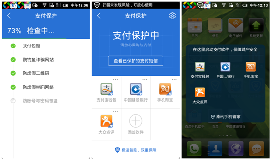 而“支付保险箱”则将用户手机中安装的所有手机网购、支付、生活服务等各类与支付相关的手机应用均放入“支付保险箱”,这些应用均经过腾讯手机管家的严格安全检测,确保不包含病毒,同时从“支付保险箱”中打开这些手机应用的时候,会进行支付安全环境检测,包括盗版、WIFI、钓鱼等,确保用户网购支付的安全。