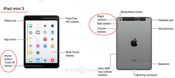 目前iPad mini3 被曝光的数据详情比iPad Air2少,不过可以预测到的是其新特性或许配备Touch ID以便支持Apple Pay等重要战略性功能。