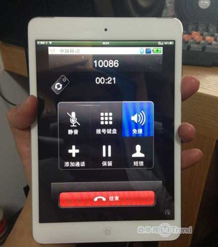 关于iPad和Mini打电话的问题,原本肯定是不可以打电话的,如果装上通讯软件(QQ、微信、网络电话软件等)倒是可以实现语音通讯,不过这要对方也装有该软件才可以,还是不够方便。有些果粉确实威武,充分发挥创造性,将iPad mini改造成了可以直接打电话的。
