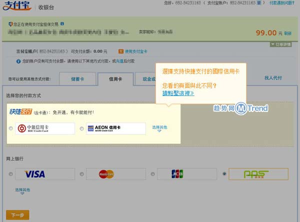 2、使用信用 卡快捷(支持香港、澳门、新加坡),香港、澳門中银信用 卡和AEON信用 卡可使用快捷支付。