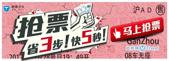 百度卫士抢票宝官方广告标语:抢票省3步快5秒,意为: