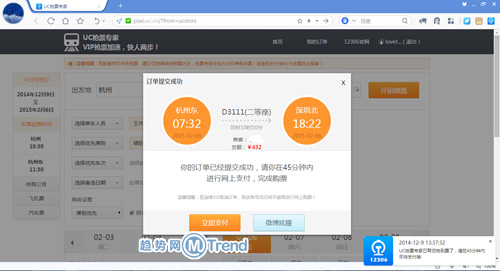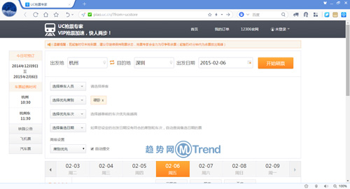 趋势网(微博|微信)讯:2015春运高峰火车 票手机抢票软件浏览器比较,手机抢票软件哪个快之UC抢票专家。这几日12306网站升级验证码屏蔽抢票软件,对比百度卫士抢票宝、360抢票、搜狗抢票、猎豹抢票等抢票代理软件,UC抢票专家已先一步破解。