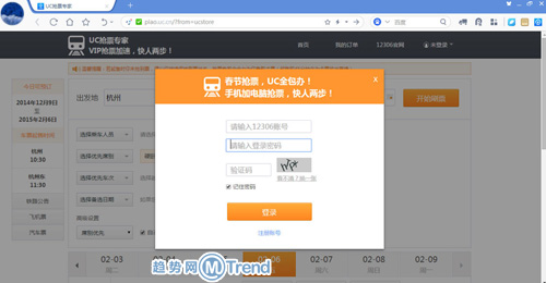 UC抢票浏览器有手机版和电脑版,其优势为“春节抢票,UC全包办,VIP通道,快人两步,利用遍布全国的阿里CDN网络,建立最快抢票通道,争夺每一分,节省每一秒”。据悉,在这两天12306屏蔽抢票软件升级网站验证码时,UC抢票专家最先突破重围,成为唯一可用的抢票软件。