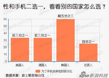 波士顿咨询公司就做了一项相关调查,看人们在性和手机、性和外出就餐、性和周末休息之间如何选择。该调查从2014年9月到11月,历时2个月,调查了美国、德国、巴西、韩国、中国和印度6个国家共计7500左右被调查者,其中1003名是美国人。在手机和性的选择上,韩国人对手机最为钟爱,过半用户宁愿选择手机也不选择陪伴爱人。在其它问题上,超过55%的美国人表示他们愿意在长达一年多的时间内放弃外出就餐,而不是放弃玩手机。