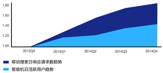 2014年,智能机日活跃用户数增长放缓,手机网民人口红利逐步消失,但百度移动搜索保持了高速增长。