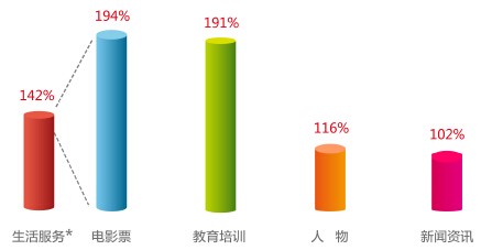生活服务:衣食住行玩各方面搜索量在移动端增长迅猛;同时提供服务的路径越短,越受用户亲睐。
