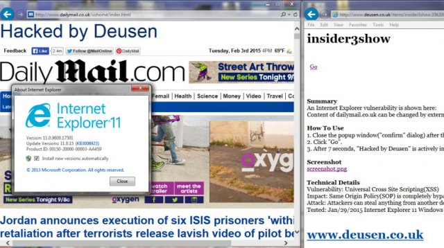 为了演示这个攻击,将在每日邮报的网站中注入“Hacked by Deusen”字样。但是这也有可能会盗取以HTML为基础数据的 新闻 网站,或者其他网站,以及访问者电脑上的商店。这意味着窃取身份验证cookies对于攻击者来说是小事一桩,因为在许多网站中,一旦访问者输入了一次用户名和密码,网站就会授予访问权限。只要拥有了这个cookie,攻击者也同样可以访问那些通常只提供给被侵入用户才能进入的限制区域,包括信用 卡数据,浏览器历史记录,以及其他保密数据。非法钓客还可以利用漏洞骗取人们泄露敏感网站的密码。