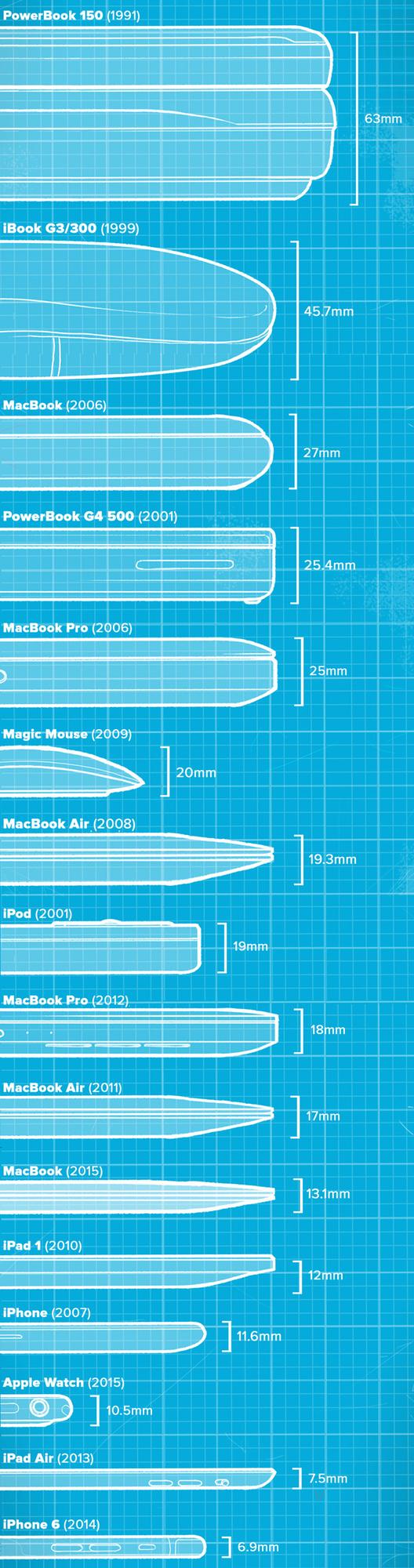 对此,有美国科技媒体就拿这款产品的厚度同苹果历史上所推出的一系列产品进行了对比,以帮助尚未接触到这一产品的消费者更加清楚的了解全新Macbook的轻薄理念。