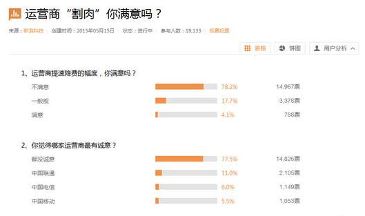 今天下午,新浪科技发起《运营商“割肉”你满意吗?》调查,2小时近2万网友参与,八成网友对运营商的优惠幅度不满意,认为运营商此次资费调整没有诚意。