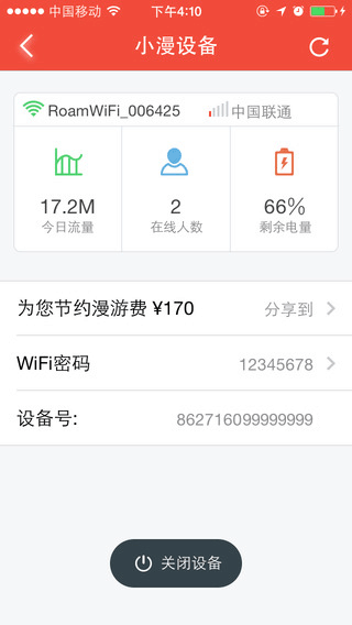 按下按钮,就可以搜索到小漫WiFi的信号了,机身的侧面印有独一无二的WiFi名称和密码。值得一提的是,小漫团队还推出了配套的手机APP,可以看到设备的剩余电量,链接设备数量,使用的流量以及采用服务的运营商。