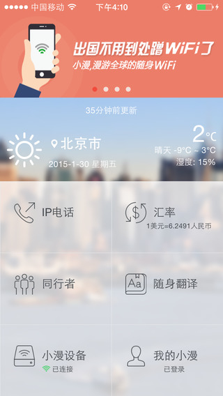而朱志金表示,小漫WiFi只是一个开始,为了实现“在其他国家也能和在自己国家一样方便”的目标,小漫WiFi的app集成了「天气」、「汇率」、「翻译」、「国际电话」功能,基本出境旅行需要的工具式服务都被囊括其中,未来还将发力旅行社交、旅游购物、当地服务等功能,也有想法让国际流量越来越便宜,陪你在路上走的更远。