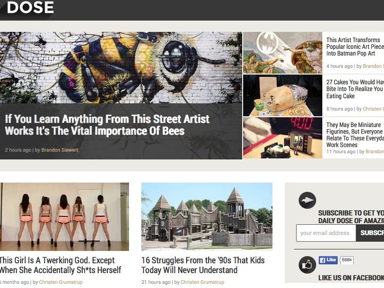 仅仅一年的时间,“我们就从一无所有获得了4500万月独立访问量,这也是我们现在的近况。”如今,Dose已经不再是一个网站了,它成了运行其他网站的平台。