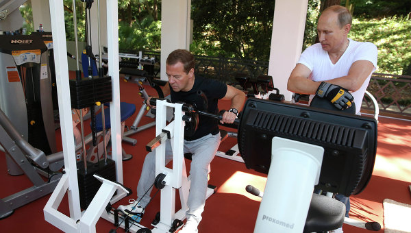 从普梅组合同志式、伙伴式的相互协助关系 我们不难发现两位的亲密。据报道称,星期日上午,普京和梅德韦杰夫在索契的官邸健身房内更是上演了一场“基情”满满的健身秀。运动期间,普京练习器械,看起来专业范儿十足,梅德韦杰夫在一旁仔细观看,稍作活动后,两位转而进行练习肌肉力量。
