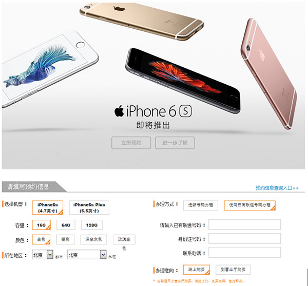 趋势网(微博|微信)讯:中国联通率先开启iPhone6s和iPhone6s Plus合约机预约,用户可选择线上购买或到营业厅购买,办理预约的用户需提供联通手机号码、身份证号码和联系电话,并选择苹果6s的颜色、机型、容量。