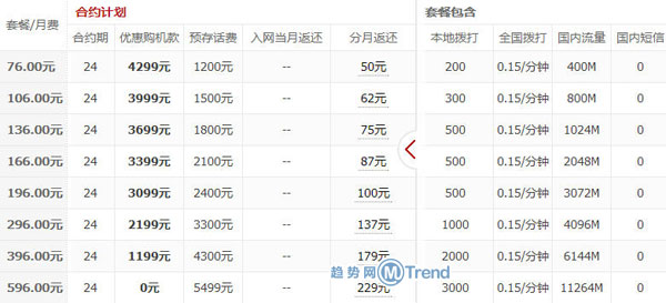 联通iPhone合约套餐分为76元、106元、136元、166元、196元、296元、396元、596元8档,其中596元相当于0元购机。