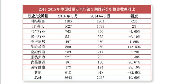 这是中国质量万里行2015年第三期投诉分析报告,从中我们可以看到,旅游教育投诉总量为790例。虽然看起来并不多,但是,根据截取近两年中国质量万里行第3期的消费者投诉量的数据显示,旅游教育、网络服务是投诉量增长最为快速的两大行业。随着人们生活水平的提高、国内高铁等轨道交通便利化、互联网旅游应用的丰富,越来越多的旅游者青睐在网上选购旅游产品。在线旅游越来越红火,与此同时,其也成为旅游投诉的重灾区。