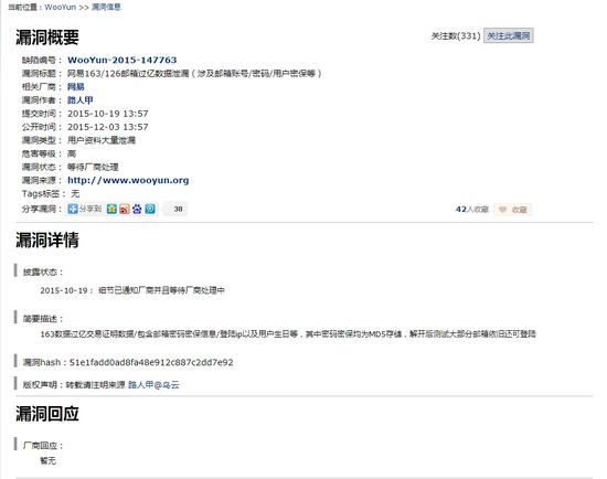 趋势网(微博|微信)讯:10月19日下午,乌云宣布发现新漏洞,此漏洞将导致网易163/126邮箱过亿数据泄漏,泄露信息包括用户名、MD5密码、密码提示问题/答案、注册IP、生日等。