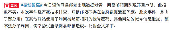 而网易邮箱立即在微博上对数据泄露事件予以否认,称”网易邮箱数据库不存在被攻击和泄露情况,黑客获得部分用户在其他网站与网易邮箱同名的帐号和密码,并以此帐号和密码来尝试在其他网站的登录,并非网易邮箱数据泄露”。