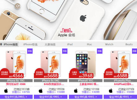 趋势网(微博|微信)讯:双11双十二Apple手机降价打折促销活动信息汇总!双11天猫苏宁京东iPhone促销页面网址、电商双十一苹果6s哪家价格最低比较!