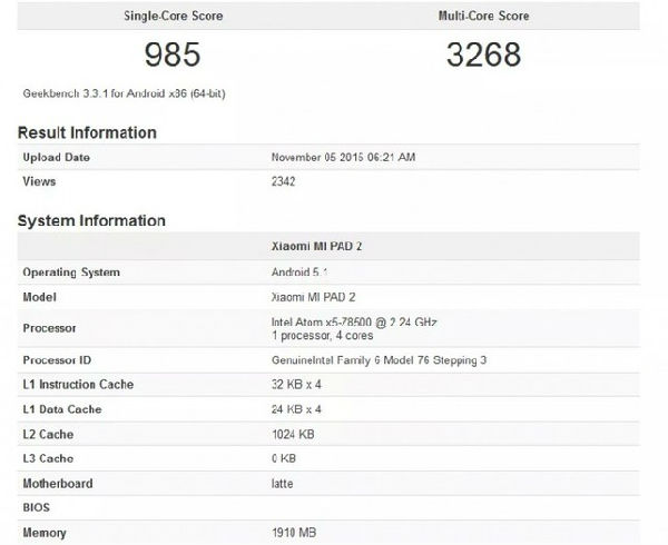 在跑分测试中,小米平板2单线程得分仅985,多线程为3268。作为对比,小米平板一代单线程和多线程跑分别有1000+、3200+,可见小米平板2在核心配置上提升不大。Geekbench数据显示,小米平板2搭载了英特尔Atom X5-8500四核芯片,主频2.24GHz。这款英特尔处理器采用了14nm工艺,集成第八代HD Graphics显卡,最大支持8GB内存、2K屏幕,是一款面向中端市场的X86构架处理器。