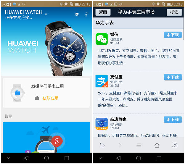 到了使用部分,HUAWEI WATCH首次使用需要蓝牙配对,而且需要一台装有Android Wear应用程序的Android设备。该APP目前支持手表的表盘主题更换和第三方应用安装,诸如微信、支付宝、地图类等应用都可以直接在Android Wear上运行。