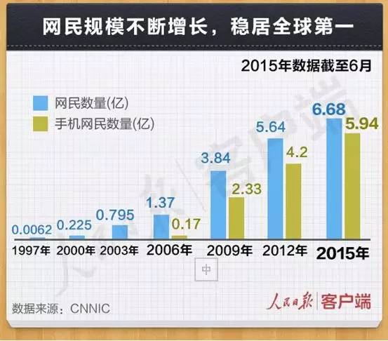 中国网民数量早在2008年就跃居全球第一,目前仍在增长中。截至2015年6月,中国网民已达6.68亿人,比整个欧盟的人口数量还要多。