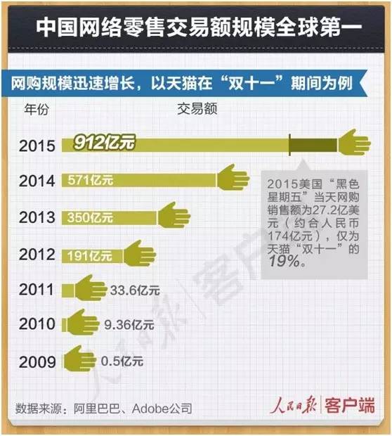 电子商务改变了绝大多数中国人的生活,网购规模年年创新高。今年,仅天猫“双十一”一天就创下交易额912亿元,而美国的“黑五”当天网购的销售额仅相当于174亿元人民币,为天猫的19%。