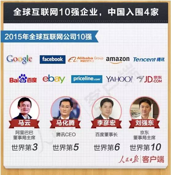 中国互联网企业突飞猛进,进入世界前列:全球互联网公司10强,阿里巴巴,腾讯,百度,京东4家中国公司入围。