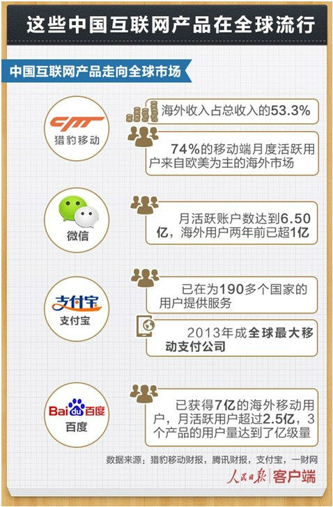 中国的互联网产品和品牌不仅在国内家喻户晓,在世界上也小有名气。支付宝早在2013年成全球最大移动支付公司,微信全球月活跃账户已达到6.5亿,百度旗下移动产品已在海外收获7亿用户,猎豹74%的移动端月度活跃用户来自欧美为主的海外市场。