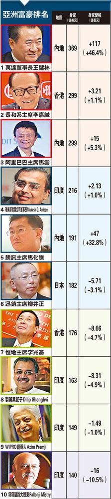 紧随其后的是李嘉诚和马云,两者的身家总数均是299亿美元,在全球富豪榜分别名列20位和21位,在亚洲则位列亚军和季军,也是世界富豪排名中第二及第三位的华人。