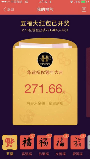 2月8日,随着新年到来,支付宝的集福卡活动也正式揭晓结果,截止2月8日零点18分,共79万多人集齐了五福,平分2.15亿现金红包,这意味着每一个集齐五福的用户可以得到271.66元。