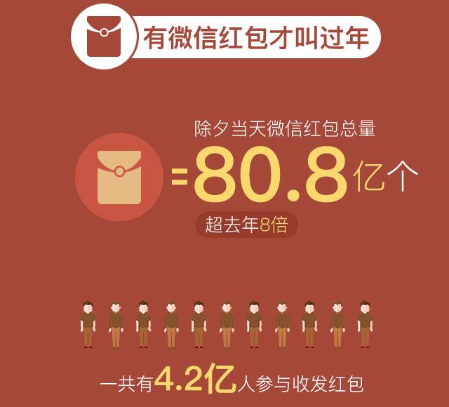 数据统计,昨夜,腾讯旗下QQ红包、微信红包收发总量超122亿个,达去年同期7.5倍。其中,微信红包收发总量80.8亿个,QQ红包42亿个,双双创下历史新高。