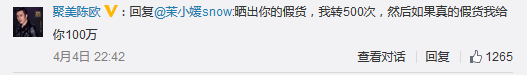 趋势网(微博|微信)讯:昨日聚美优品CEO陈欧在微博上表示:“今天开始,谁再黑我,我一定撕.逼到底,别以为黑人是没有代价的”,并称如果聚美平台上存在假货,就赔偿100万元。