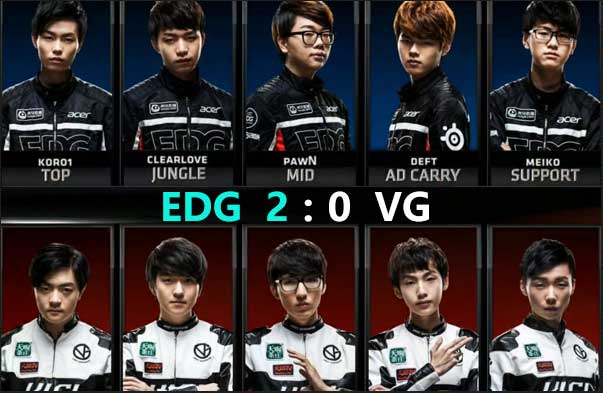 4月3日EDG迎来了VG的挑战,VG首轮比赛便错失大好开局,葬送了比赛,而在第二轮领先开局的情况下,又因为EDG“双传送”的绝妙套路,再度败北,以0:2结束了本场比赛。这两局比赛VG前期都打得很顺,但EDG最终通过临场改变策略和抓机会反打赢下比赛。另外EDG的AD选手Deft拿到了本场比赛的MVP,他这局拿出艾希就已经很少见,而且在Pawn的卡牌无限崩盘的时候自己稳稳地发育,大招开团找机会反打,团战爆 炸输出,数据堪称完美。