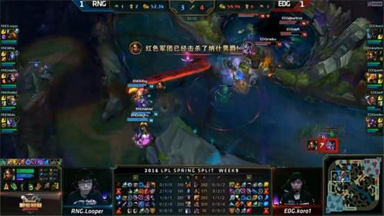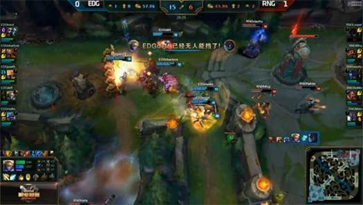 第二局,急欲锁定胜局的RNG开局就掀起了一波波攻势,而EDG则更沉着冷静的蓄积着自己的团战优势,抓住时机与对手展开凶猛对攻。在前期上路爆 炸的情况下,EDG没有选择上局的稳妥发育,而是不断在寻求机会主动求战。最终凭借近乎疯狂的输出,第28分钟,EDG以漂亮的一波,带走RNG,将比分改写为1:1。这也成为了本场比赛一个重要的战略转折点。