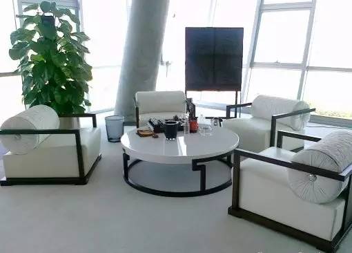 外间的接待室,中间是一组简单的黑色沙发。沙发对面白色的造型特别墙体。一侧摆放着一辆山地自行车,据介绍这是一辆王石在某个赛事上骑过的自行车。万科有山地自行车骑行的传统,且是参与程度较高的一项集体运动。